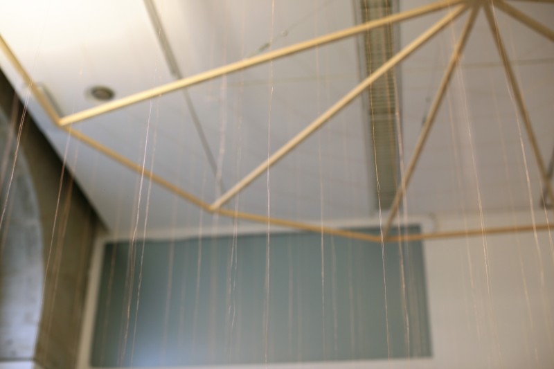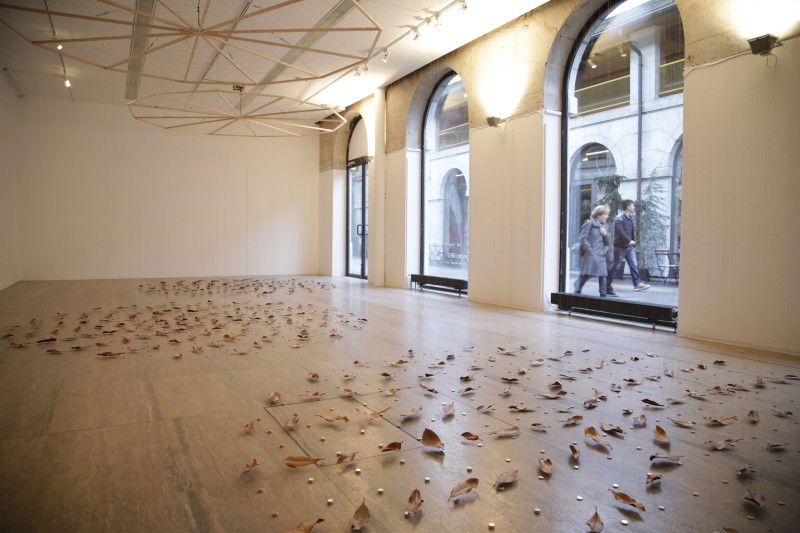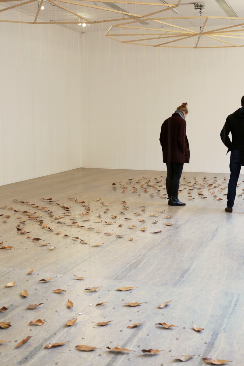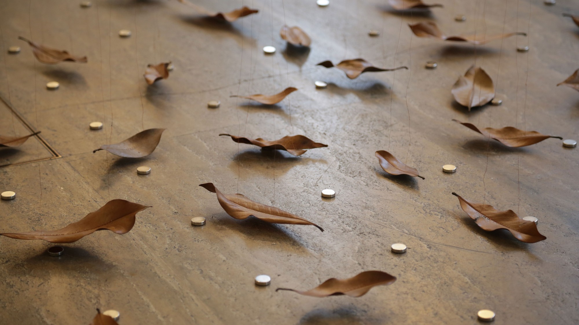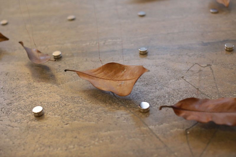 Elles effectuent des lentes rotations à vitesse fixe. De ces rosaces tombent des fils de cuivre fins. Au bout de chaque fil est suspendue une feuille séchée de Magnolia Grandiflora. Le fil traverse chaque feuille de part et d'autre par une couture. Les feuilles sont suspendues horizontalement, frôlant le sol et les aimants qui y sont placés.