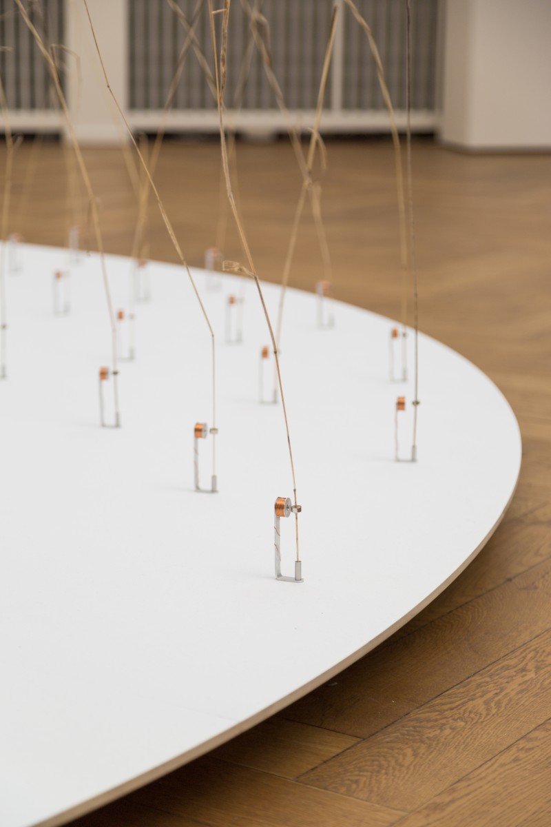 Ce sont 162 brindilles d’herbes hautes qui sont mises en vibrations aléatoires par un système électromagnétique simple. La base est faite d’une bobine de fil de cuivre, et la tige est montée d’un aimant cylindrique.